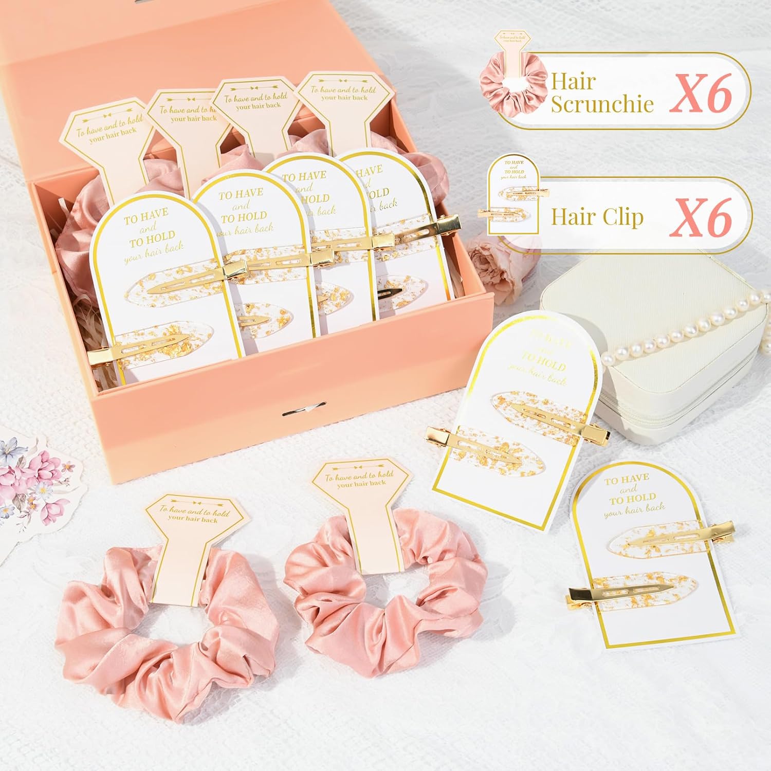 AILEAM Bridesmaid Gifts, Including 6 set (Each set includes 2 crease free hair clips comes with the card ) gold glitter bridesmaid hair clips and 6pcs silk satin soft bridesmaid hair scrunchies It would be perfect addition to your bridesmaid’s proposal boxes!