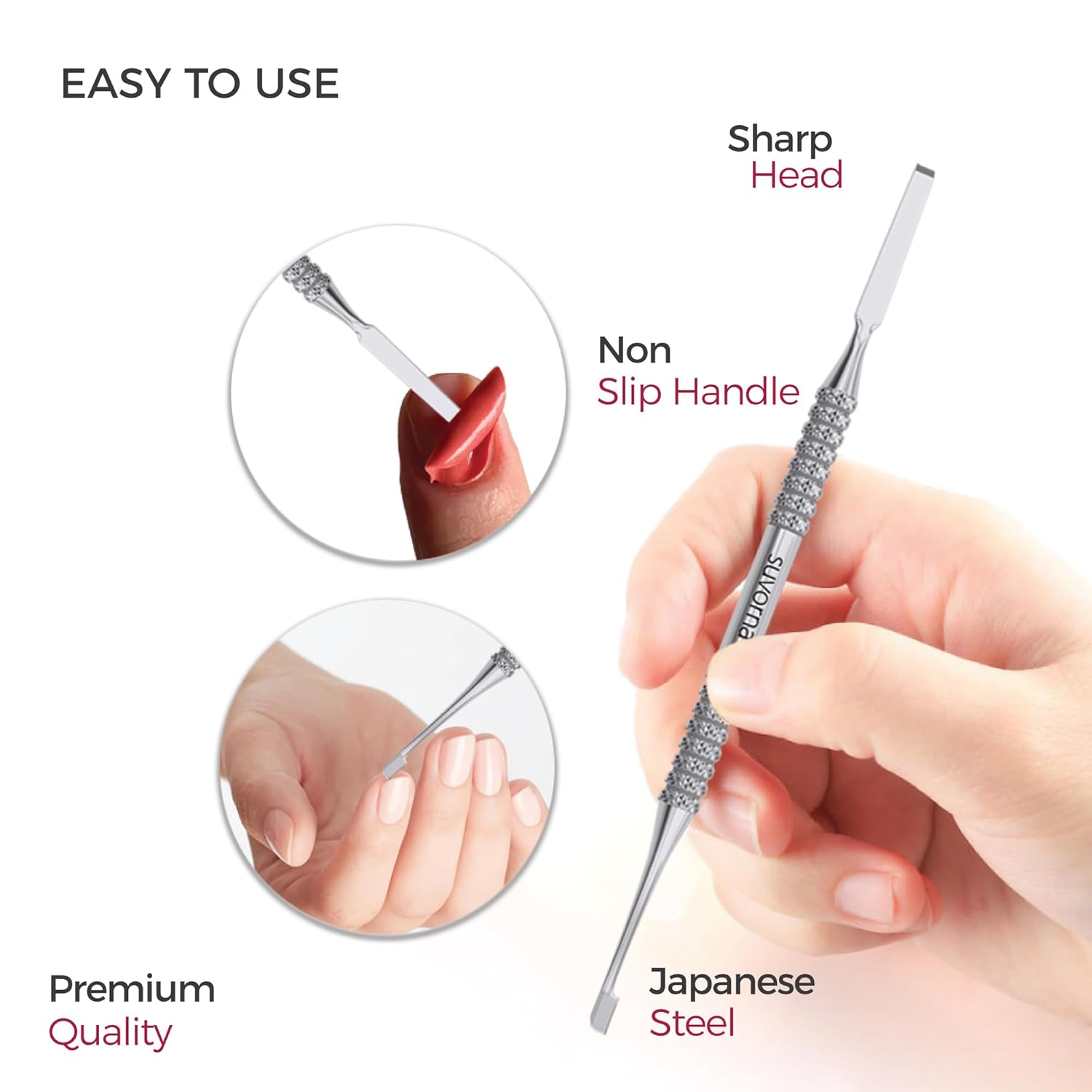Two in one: Suvorna Cuticle pushers come with two in one Gel Polish Remover Tool, Sharp blade to clean cuticles that cling to nails and other flat edge on one end to push cuticles and shape nails. Dual-ended design to create flawless cuticles. Nail Scraper Use to push and design easily and is great for pushing cuticles, scraping away soaked UV gel, shellac nail polish while giving manicures or pedicures. The second end of our is used as a Nail Cleaner Tool that is used for under nail cleaners.