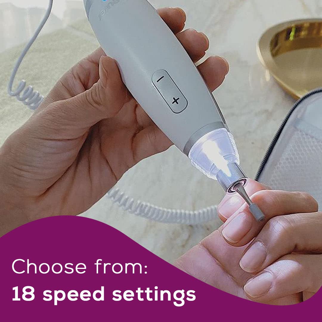PRECISE FILING: The integrated LED-light enables a more refined finish by illuminating the nail area – while the dust shield keeps your manicure and pedicure hygienic and mess-free