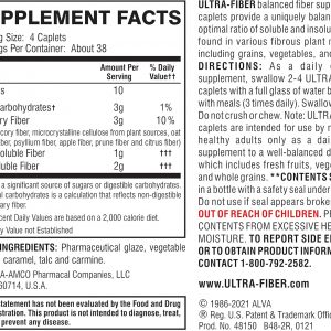 A balanced fiber supplement like Ultra-Fiber can provide both soluble and insoluble fiber to help improve regularity* without the excessive gas, bloating, and digestive discomfort that can sometimes be prompted by large servings of psyllium. Each Ultra-Fiber caplet contains 750mg of dietary fiber from chicory, oats, prunes, orange and other plant sources. It has more fiber than many other leading fiber supplement caplets and capsules, but, remarkably, in a smaller, easy to swallow coated caplet. Ultra-Fiber is suitable for everyday use for comfortable, reliable aid to lower GI health.* *These statements have not been evaluated by the Food and Drug Administration. This product is not intended to diagnose, treat, cure or prevent any disease.