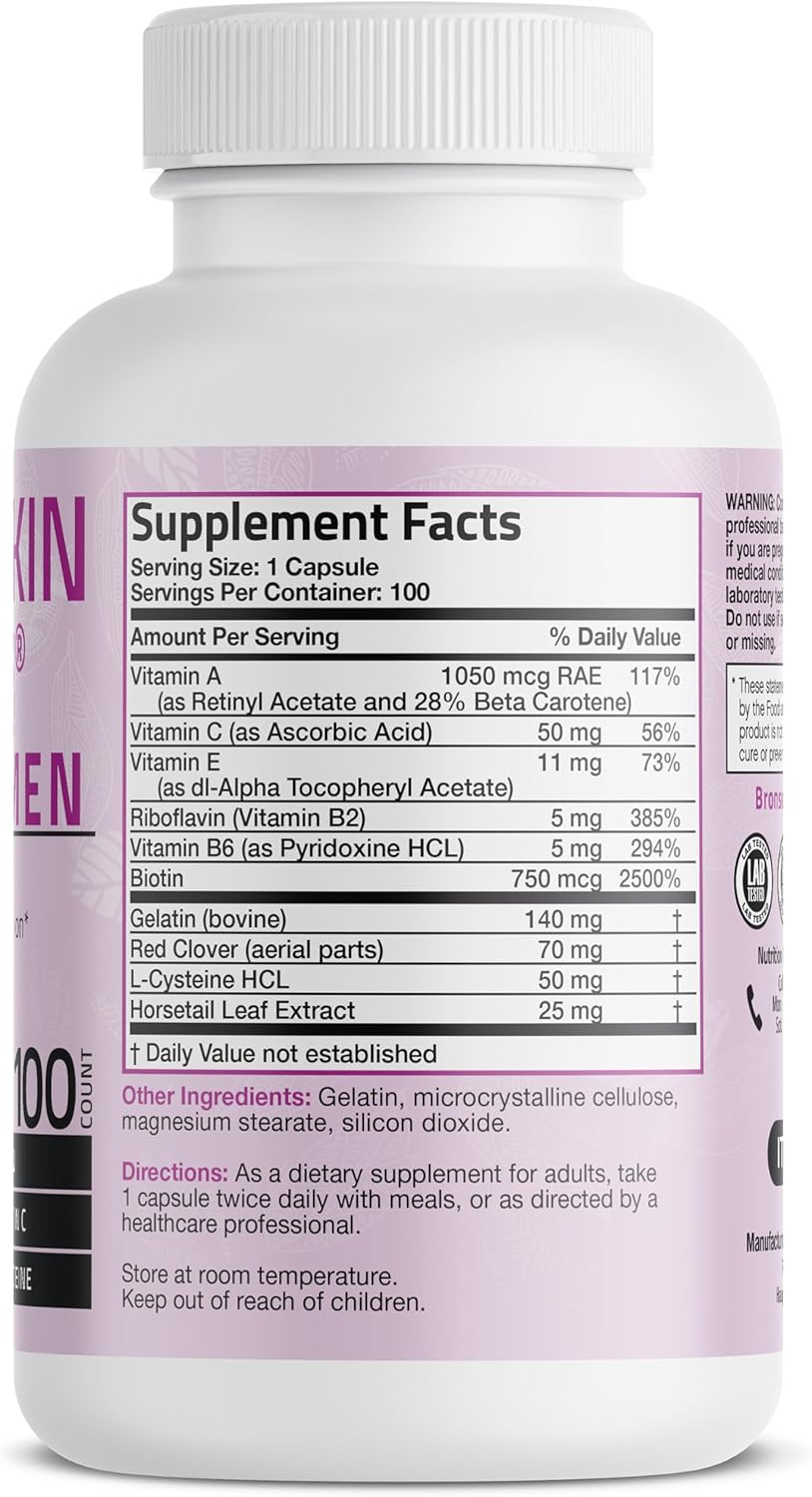 On a daily basis, the elements impact physical beauty, including aggressive sun rays, free radicals from pollution, and drying wind. Protect yourself from the elements with Bronson’s convenient Hair, Skin, & Nails multivitamin. Naturally nourish and fortify the health of your hair and nails while promoting luminous skin. Plus, Hair, Skin, & Nails adds density and strength to hair while fighting brittle nails.* Hair, Skin, & Nails also improves the appearance of wrinkles, allowing you to put your best face forward.* This is achieved through a combination of several vitamins with antioxidant properties including biotin, Vitamin C, Vitamin E, and Vitamin B6.