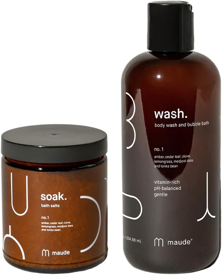 Take a dip into a nourishing and rejuvenating bathtime experience with No. 1 scented soak bath salts and combination bubble bath shower gel. pH Balanced Body Wash: Maude’s No. 1 bath soak are hand-harvested salt crystals from the Southern Dead Sea infused with bright notes of amber, cedar leaf, lemongrass, tonka bean and medjool date. This 8 oz. mineral bath salt is made in the USA. Infused magnesium sea salt bath is perfect for solo or partner soaks, this healing bath blend contains nourishing vitamins and minerals such as magnesium, potassium, sulfur, zinc and more that soften and rejuvenate the skin. Add a handful of salt crystals to warm water and swirl until absorbed. Soak for 20 minutes, then rinse and towel dry Soak No.1: Transform your tub into your own personal spa with our subtle yet sensual lathering pH wash. This daily use, fortified bubble and shower gel will be the go-to in your adventurous bath toolkit due to its balanced and gentle application for more intimate regions. Lather up and indulge knowing your skin is happy too.