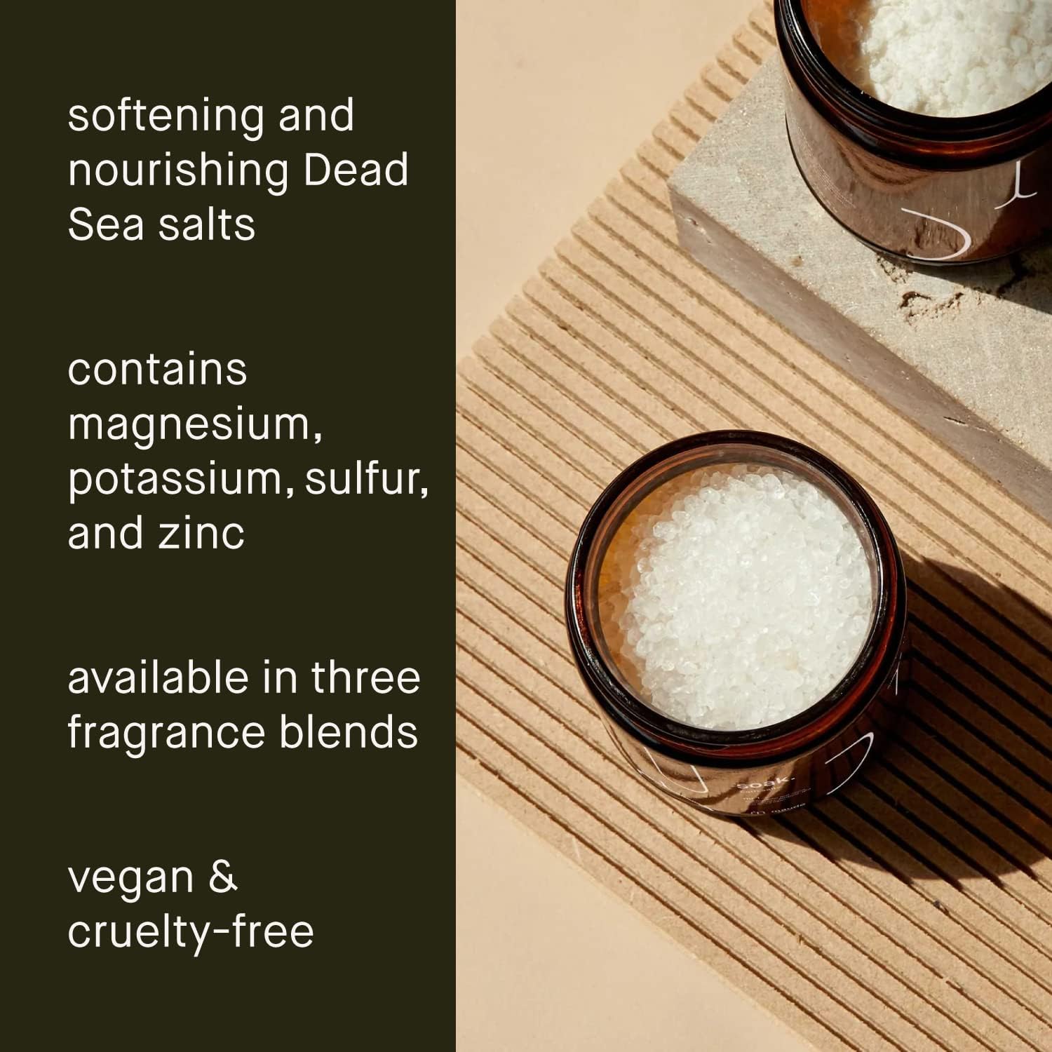 No. 1 Soak + Wash – Cleanse with our gentle body wash that doubles as a bubble bath soap before nourishing with mineral bath salts made of hand-harvested coarse dead sea salt crystals and vitamins.