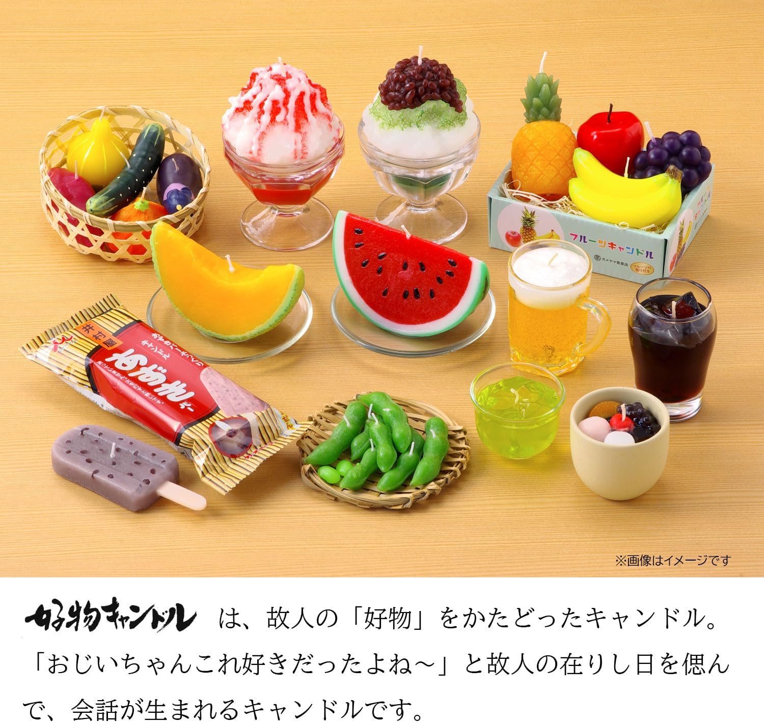 A traditional coffee shop cream soda with a sensation of the Showa retro feel is now a candle. The contrast of the transparent melon soda and the red cherries. Comes with a sweet scent of melon soda.